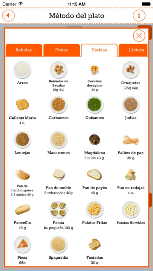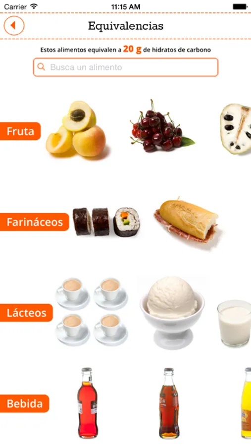 3. Equivalencias: Los alimentos aparecen expuestos en la cantidad que aportan 20 gramos de hidratos de carbono (equivalente a 2 sobres de azúcar).