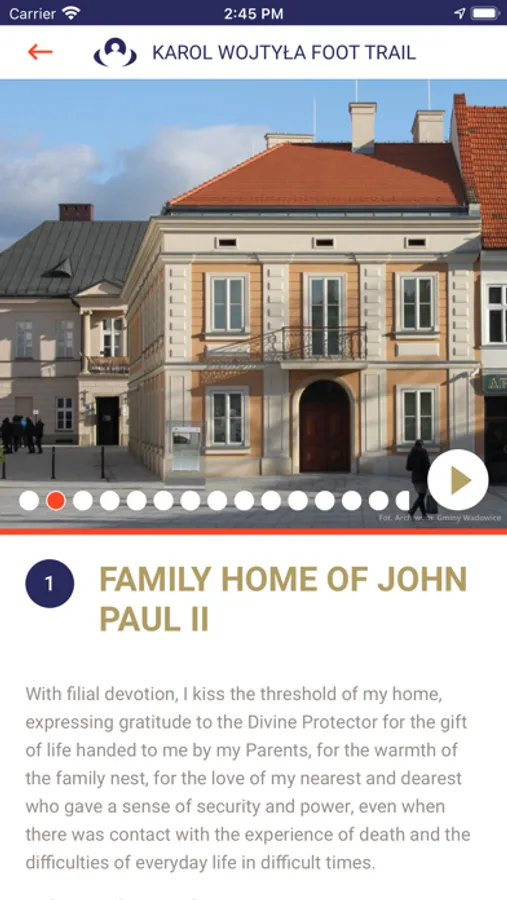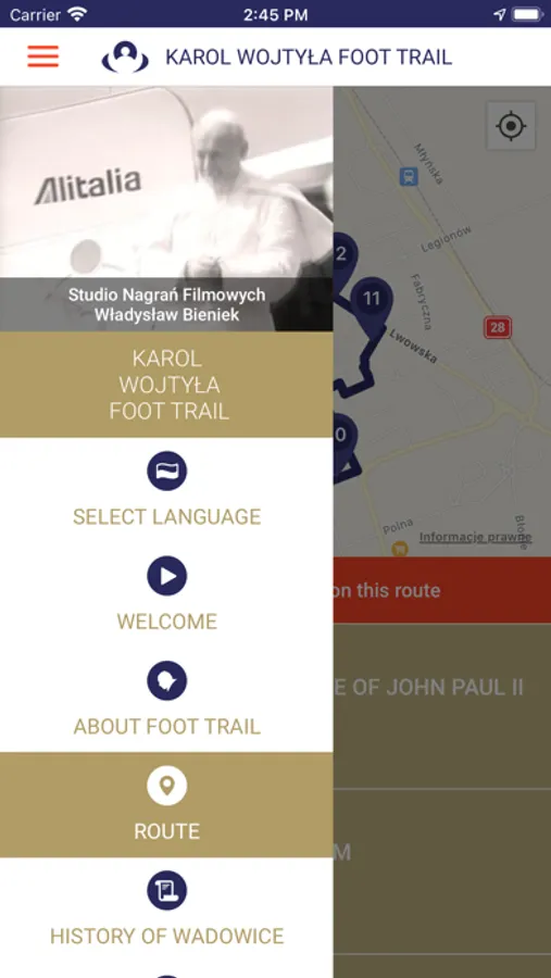 Aplikacja mobilna "Szlak Karola Wojtyły" to audio-przewodnik prowadzący po wadowickim szlaku, który łączy 13 obiektów związanych z młodością Karola Wojtyły.