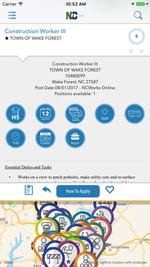 With NCWorks’s unique “Jobs Nearby” function you can easily map all the latest jobs near your current location. Search for jobs around your neighborhood or a different location. Simply tap color-coordinated pins to see more information or to apply for a job.