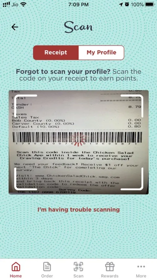 Scan: Scan your receipt to Or show your “Loyalty Profile” at the register when you order, and you will earn 1 point for every $1 you spend at the Chick.