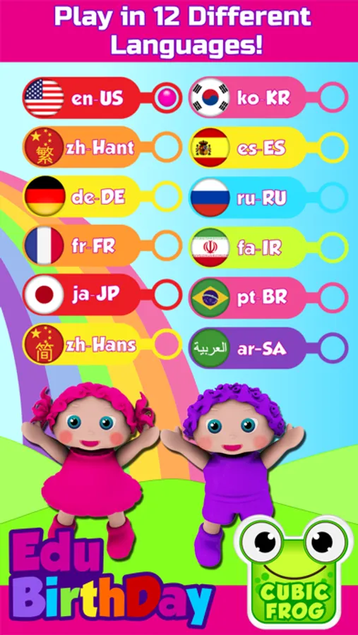(Cubic Frog®) is proud to be a global and multilingual kids' educational company with apps offering 12 different language options: English, Spanish, Arabic, Russian, Persian, French, German, Chinese, Korean, Japanese, and Portuguese. Learn a new language or improve on another!