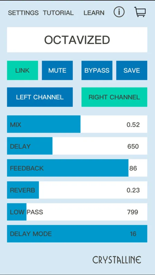 Crystalline Mini is a shimmer reverb/delay effect for Audiobus and Inter-app audio. Create synth-like tones and textures from almost any sound source, perfect for guitar, vocals, synths, sound design and more.