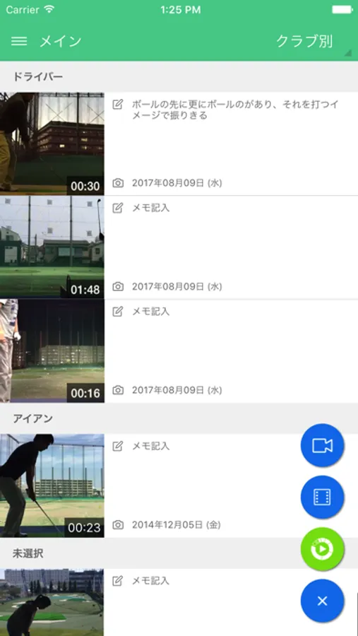 また、クラブ別・撮影日での並び替えもできるので、調子が悪くなったときの見返し用にも便利です。