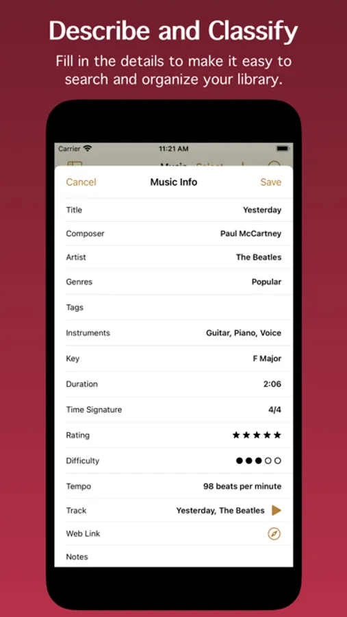 • Describe and classify your music in as much detail as you want with information like title, composer, artist, genres, tags, instruments, key, duration, time signature, rating, difficulty, tempo, track, web link, and notes.