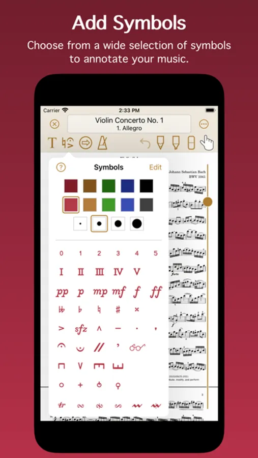 • Choose from a wide selection of symbols to add fingerings, dynamics, accidentals, and more to your music.