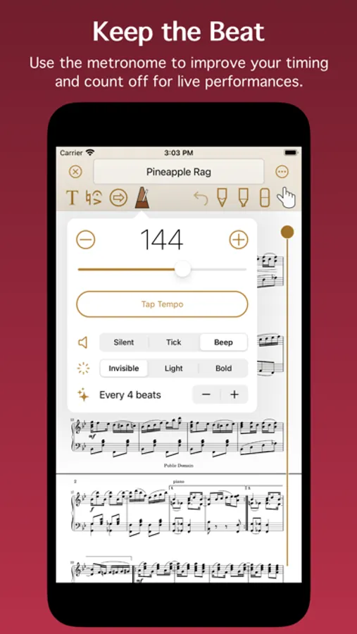 • Use the low-latency metronome with options for sound, visuals, accent, and count off.