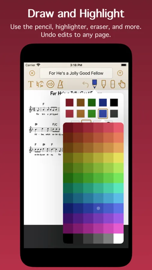 • Use the pencil and highlighter tools to write on music with your finger or with the Apple Pencil. All Apple Pencil settings are supported.