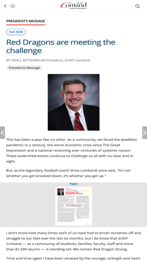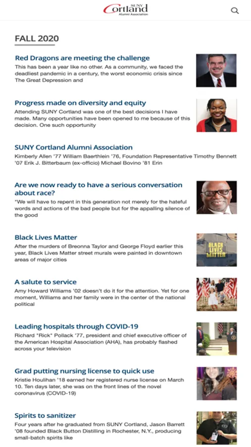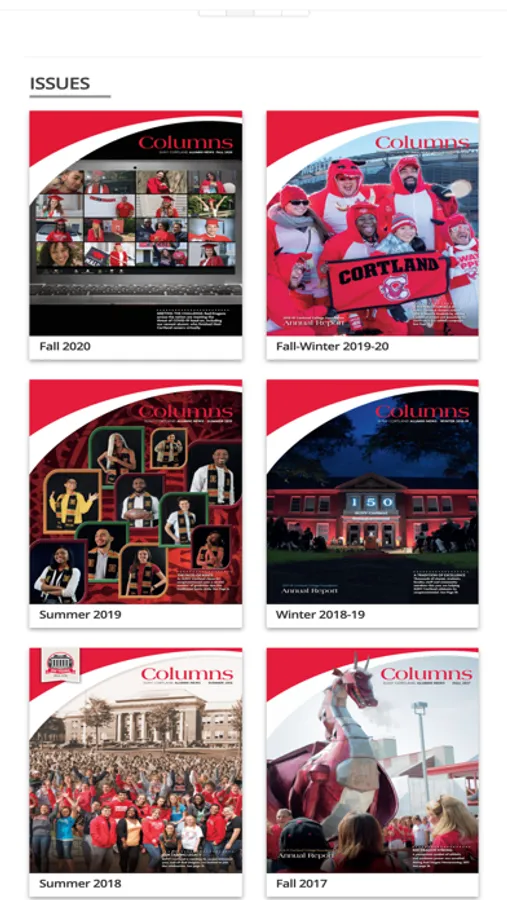 Columns, the bi-annual magazine published by the SUNY Cortland Alumni Association, provides graduates with information ranging from current events to alumni accomplishments and ways to be involved. The magazine has created a community of its own, dedicated to connecting all of our alumni to one another. Columns sets the high bar for practicing alumni engagement; offering insight into the contributions, culture and intellect of the SUNY Cortland community.