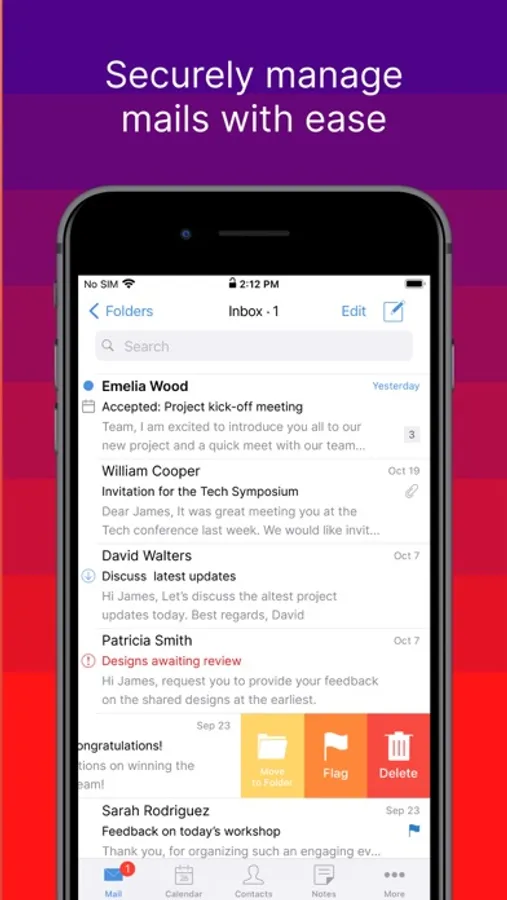 Secure Email - Secured by the Ivanti AppConnect platform and provides AES-256 encryption, application level passcode, certificate based authentication and managed copy/paste functions. Based on admin control, users can receive notifications for Email and Calendar in real-time.