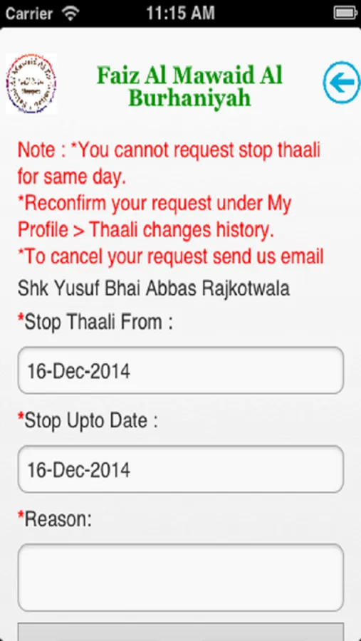 Features: (1) Announcements/Communication (2) FMB Menu (3) Thaali Delivery Status (4) Stop Thaali Request (5) Thaali Change (6) Niyaaz & Payment History
