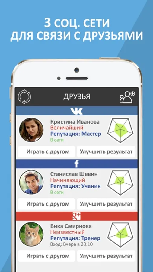 • Поиск друзей одновременно в Facebook, Google Plus, ВКонтакте.