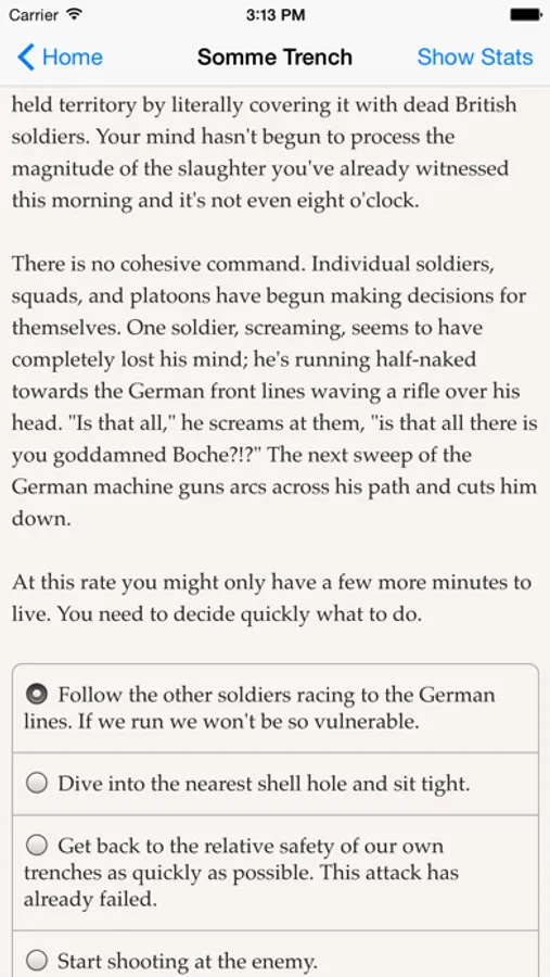 "Somme Trench" is an interactive historical novel by Andrew J. Schaefer, where your choices control the story. It's entirely text-based—without graphics or sound effects—and fueled by the vast, unstoppable power of your imagination.