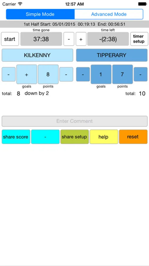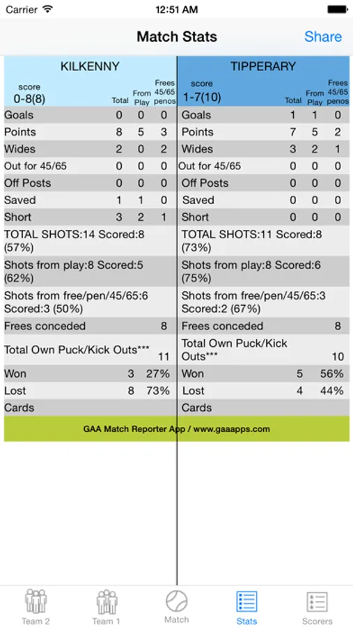 - share scores and match events such as scorer, frees, cards issued using compatible Apps on your phone such as Twitter, Facebook, Email, Text messaging.