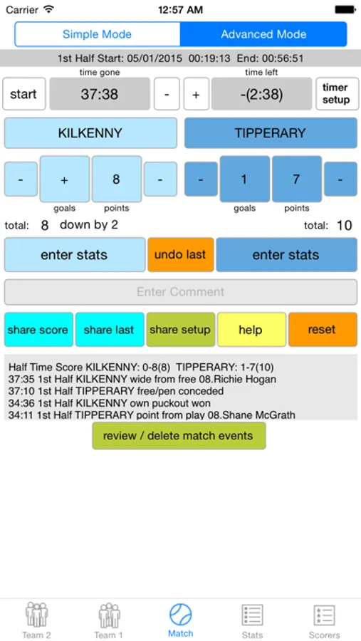 Keep track of team selections, time, scores, scorers, substitutions and match statistics at GAA football, hurling and camogie games.