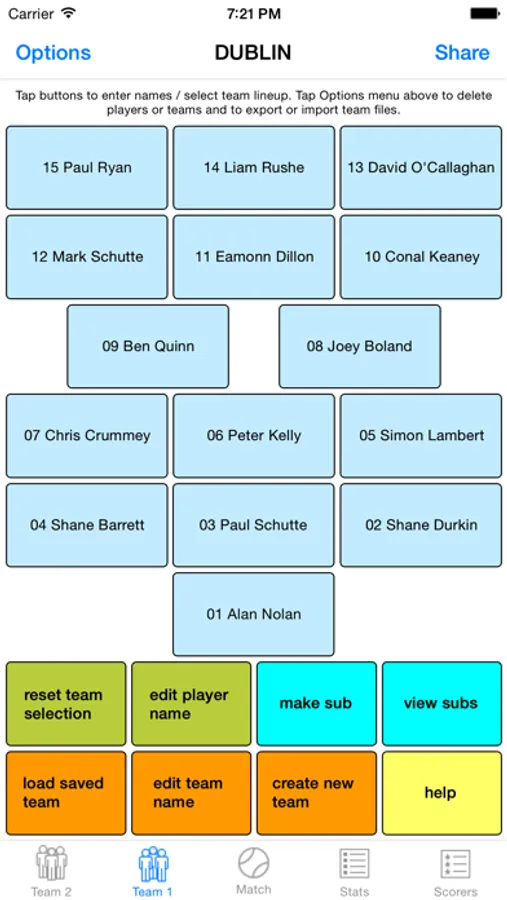 Your own team selection/panels can be saved and then emailed or uploaded to cloud storage. Team files are saved in a format that allows them to be shared into this App running on other phones/devices.