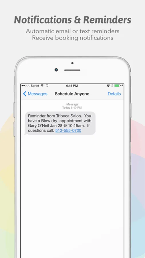 • Automatically send appointment reminders and confirmations via text,e-mail or both, specify the time before the appointment you want the reminder to be sent