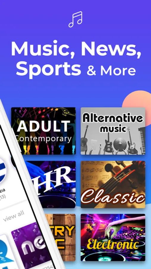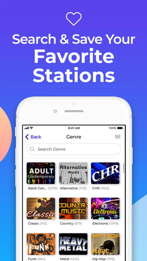 • Explore stations from over 190 genres using the frequency tuner