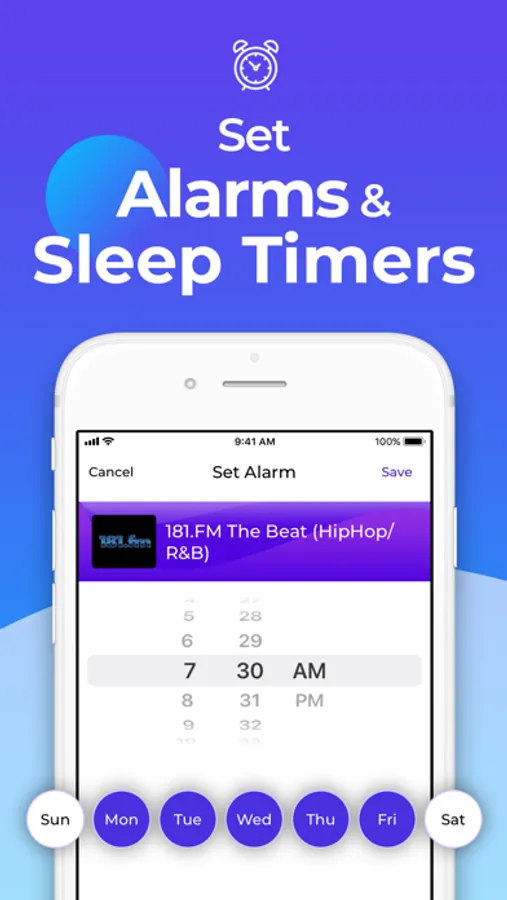 • Set an alarm to your favorite FM Radio as you wake up