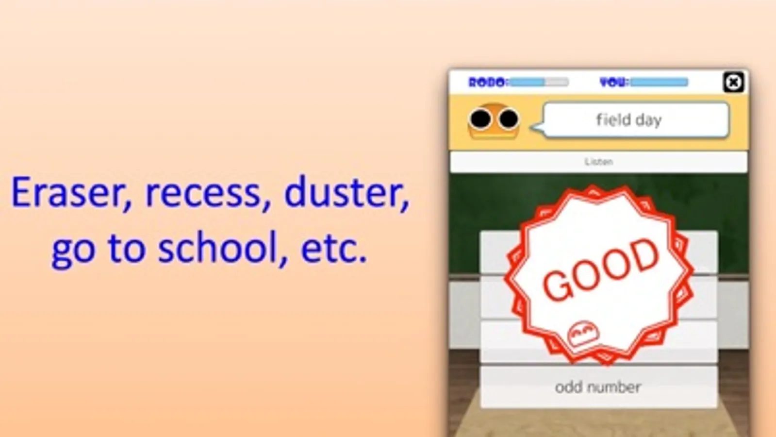 Eraser, recess, duster, go to school, etc.