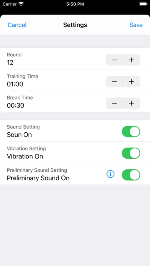 Exercise time is displayed red letters, and break time is green. Between each round, you can set a sound or vibration notification.