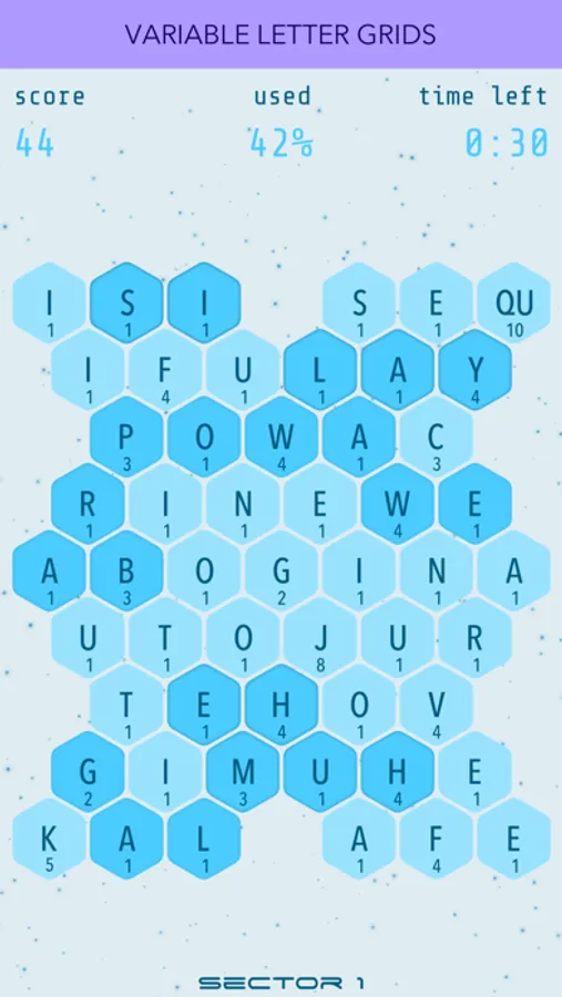 Select the letters on the hexagonal grid to compose valid words from 2 to 12 letters long trying to scoring best.