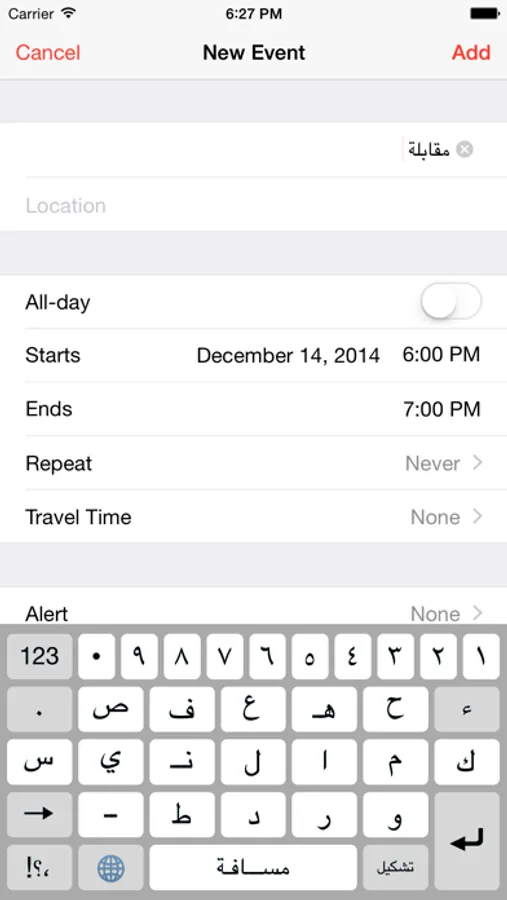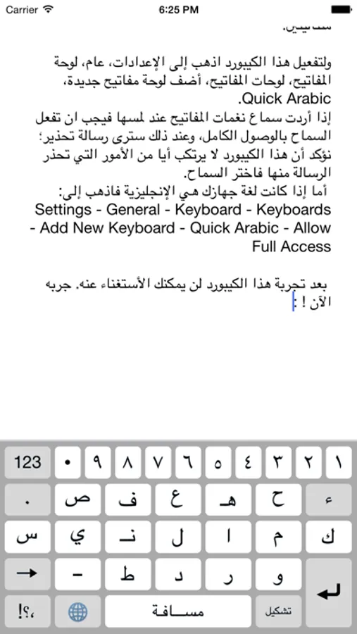 Settings - General - Keyboard - Keyboards - Add New Keyboard - Quick Arabic - Allow Full Access