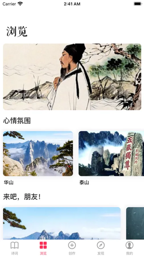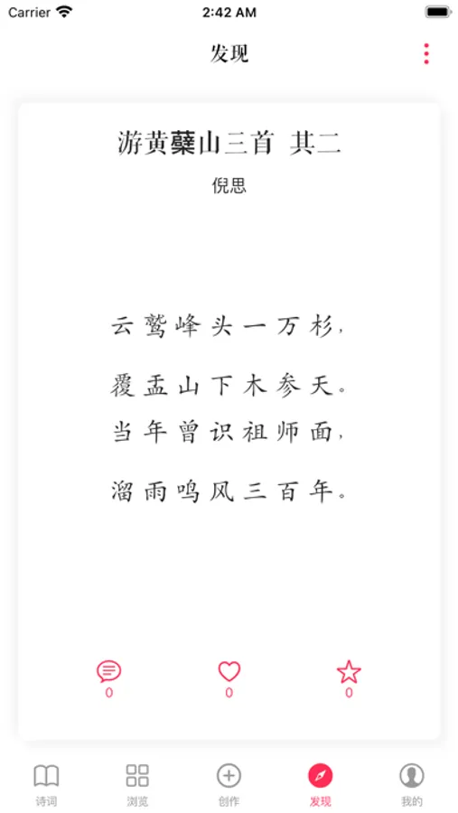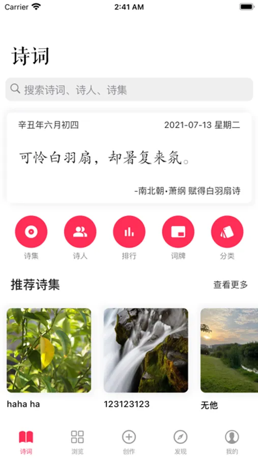3.诗词专栏:发现大家喜欢的诗词,支持诗词的随机浏览,并针对一些名人、书籍进行单独的分类浏览。