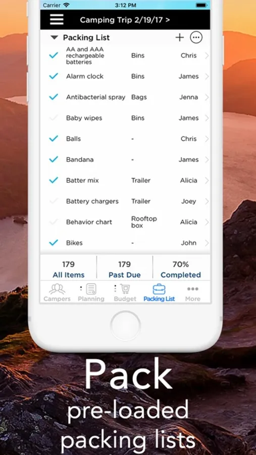 - 9 Pre-Loaded packing lists sorted by type and packing location (Car, Bags, Bins Backpacks…)