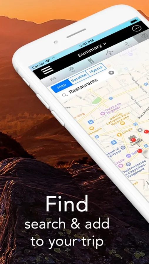 - The Map mode let’s visualize all of your planning items on the Map in Standard, Satellite or Hybrid Mode. It will also let you search for addresses or for any Point of Interests across the globe