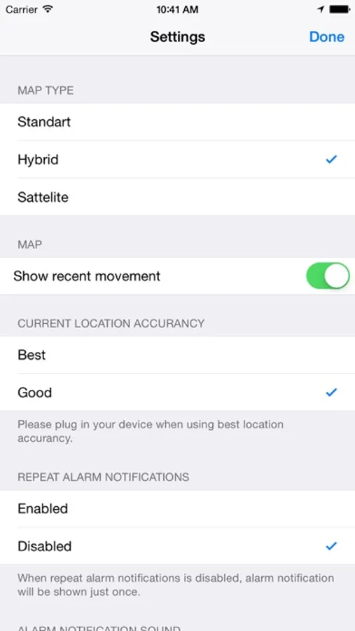 - specify, if you want to be notified only once, or till you dismiss the alarm