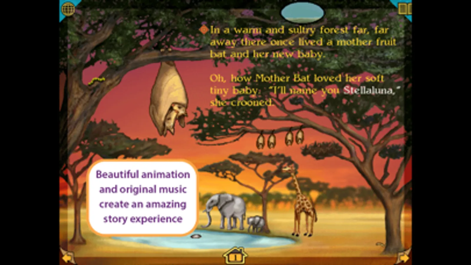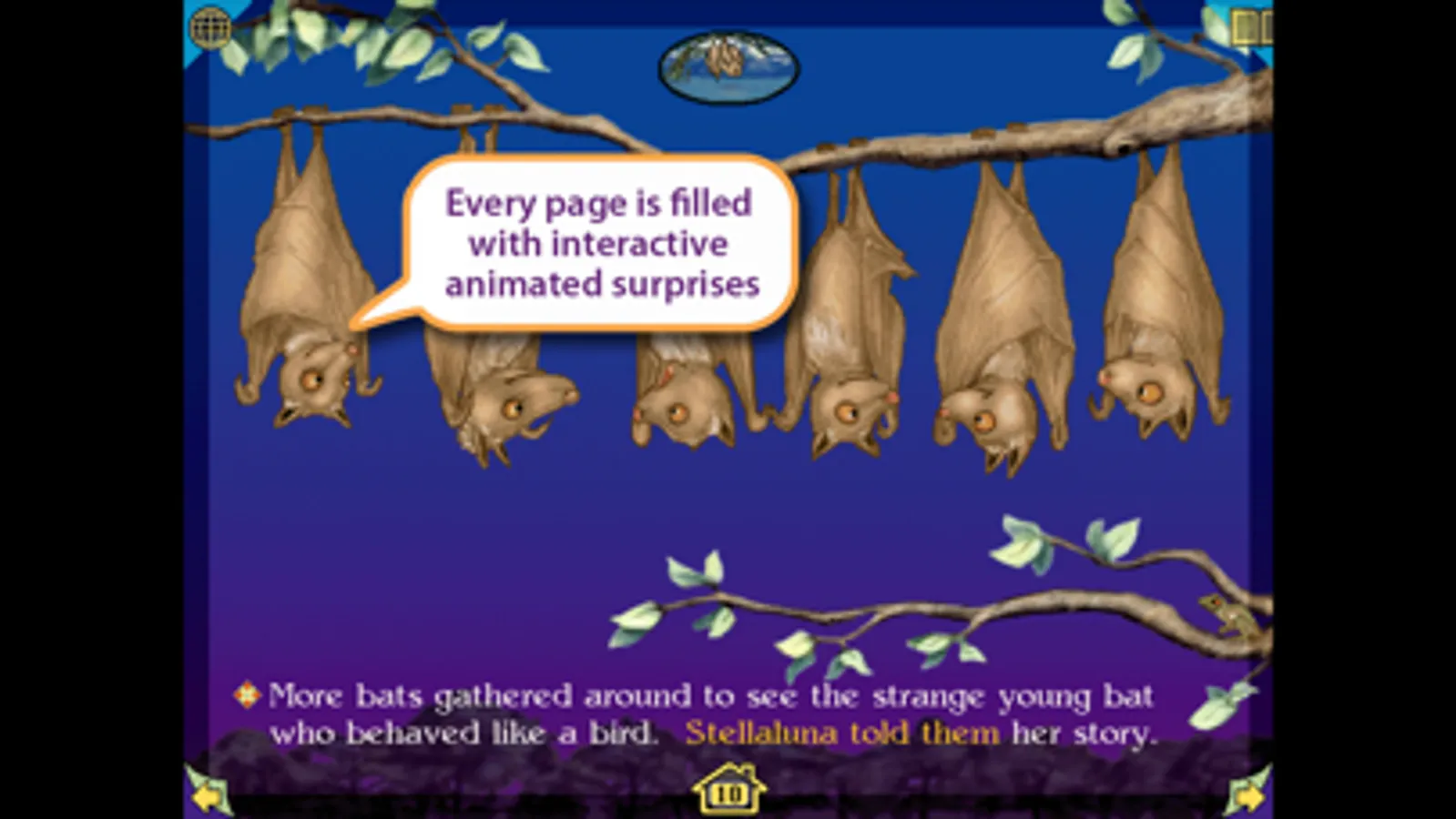 Stellaluna is the heartwarming tale of a lost young fruit bat whose world is literally turned upside down when she is adopted by a family of birds, and finally finds her way safely home to her mother and friends. This Living Books interactive adaptation by Wanderful Books of the award-winning book “Stellaluna” by Janell Cannon is an invaluable tool in sharing universal themes of upbringing, isolation, acceptance, and friendship with young learners.