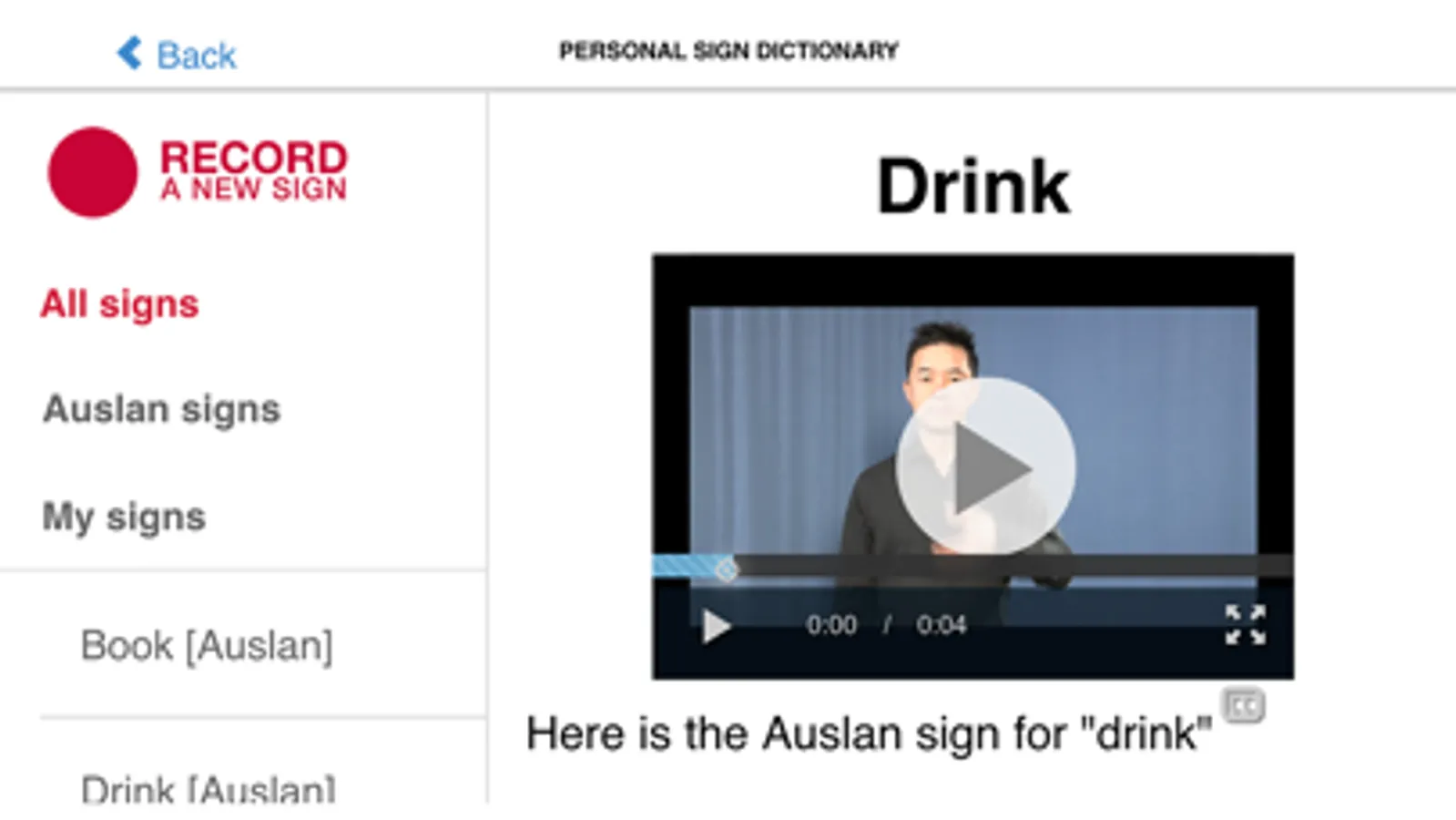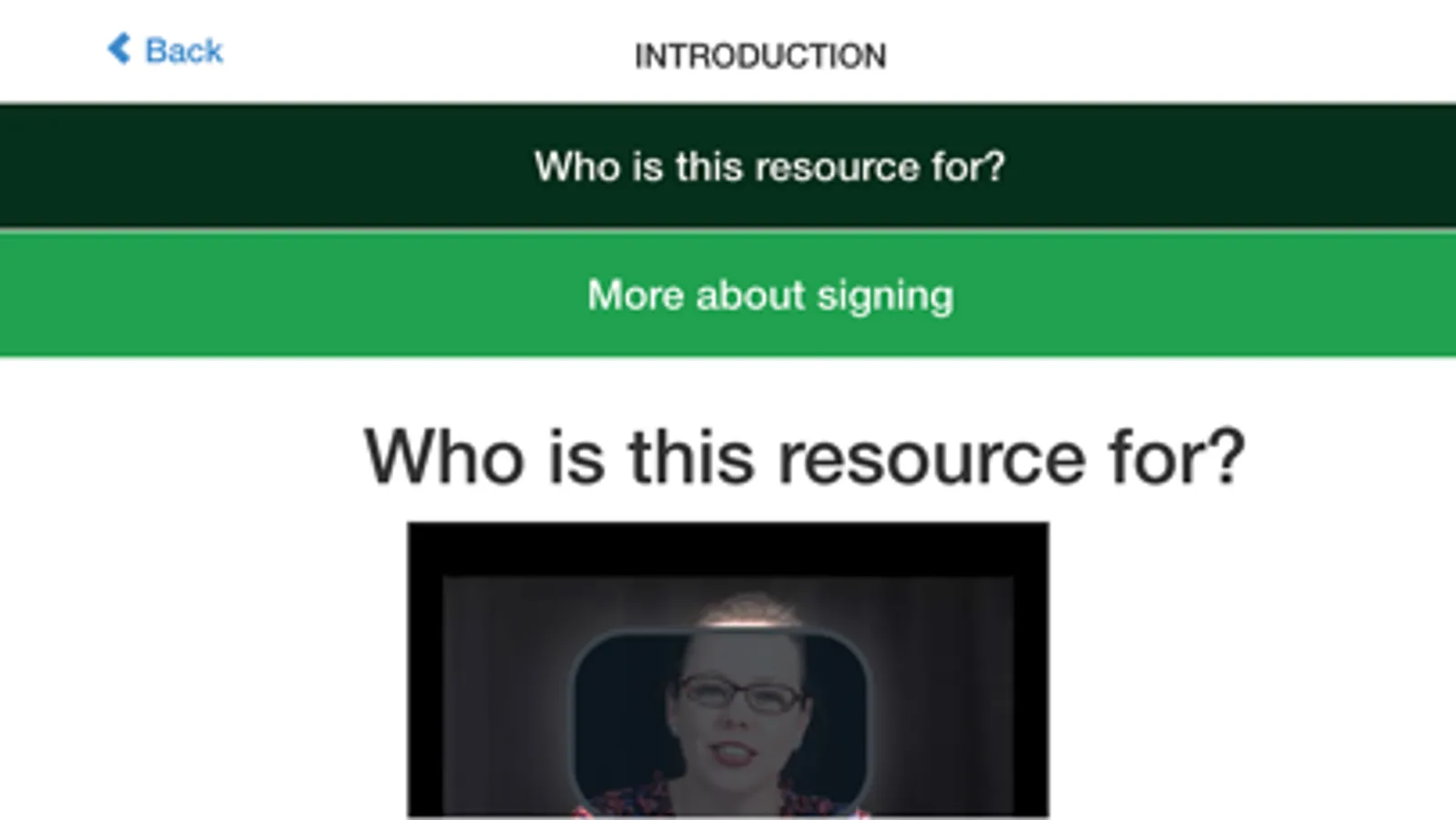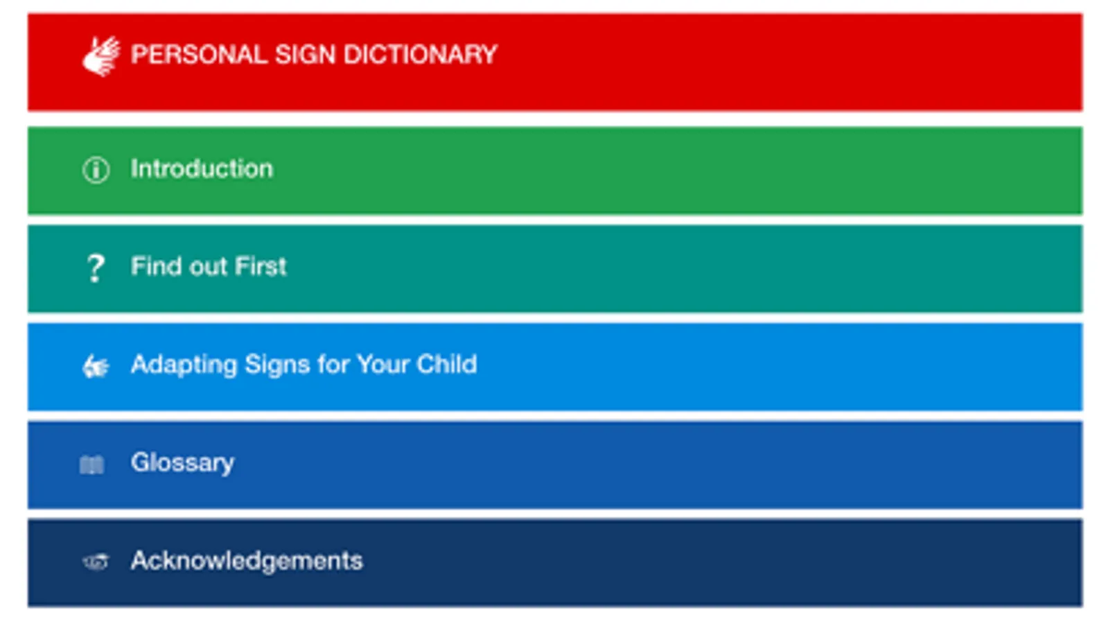 Features include: Information about vision impairment, video footage showing the step-by-step process, a small set of suggested already adapted signs, and an individualised sign dictionary to record your own signs. These features assist families to understand and use this individualised approach to signing.