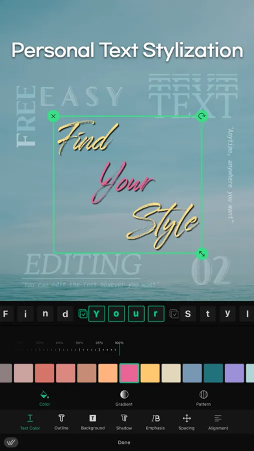 + You can make your own text style using animation, individual character coloring, shadows, and outline properties editing.