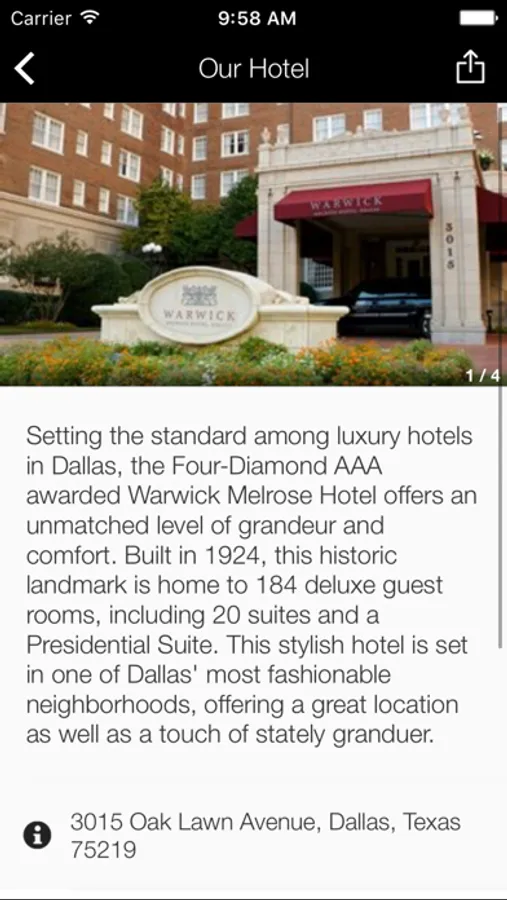 Get the most out of your stay and experience Dallas like a local. Access information provided directly by the Warwick Melrose Hotel about on-property amenities and events, recommendations for local food and entertainment, and more. Hotel staff are available via in-app messaging to make sure you receive the best possible service with your stay. Get connected to a better travel experience.