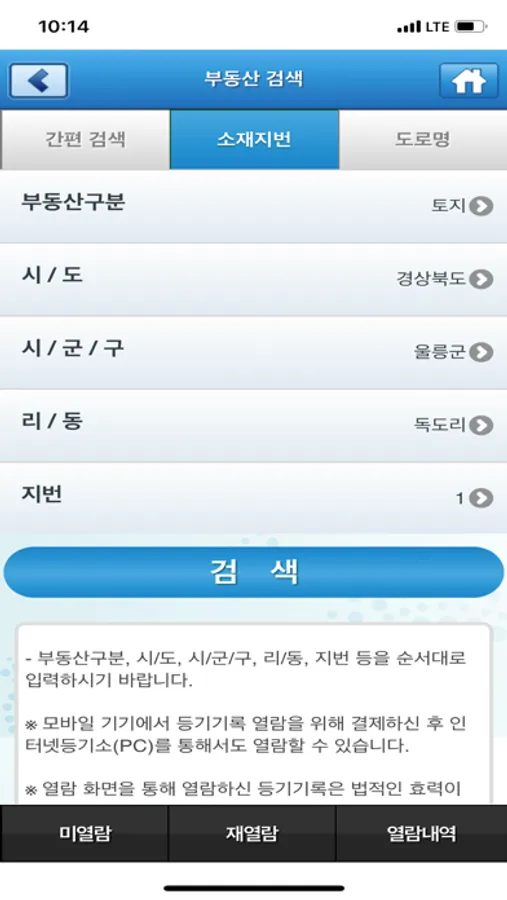- 열람대상 검색 : 간편검색, 소재지번, 도로명을 입력하여 열람대상을 검색할 수 있습니다.