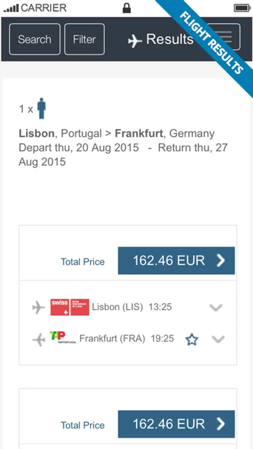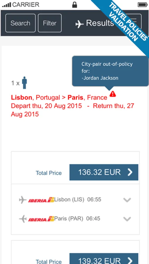 Search results are validated according with each traveller travel policy and out-of-policy results are highlighted on screen to alert the user. Travellers' out-of-policy products if added to the trip are marked accordingly during all the booking process.