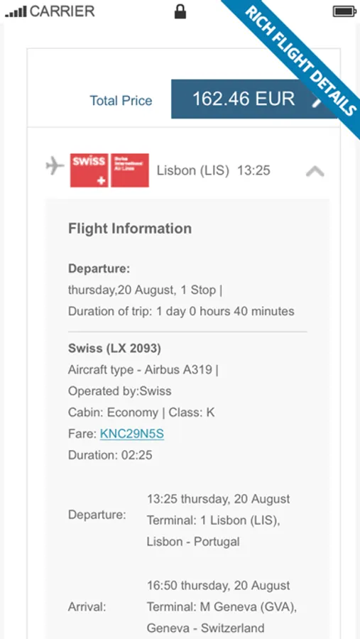 Passenger details support APIS data, Frequent Flyer card information and Special Service Requests (SSR).