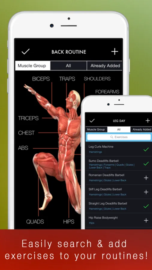 • Ability to easily add custom exercises and select different muscle groups!