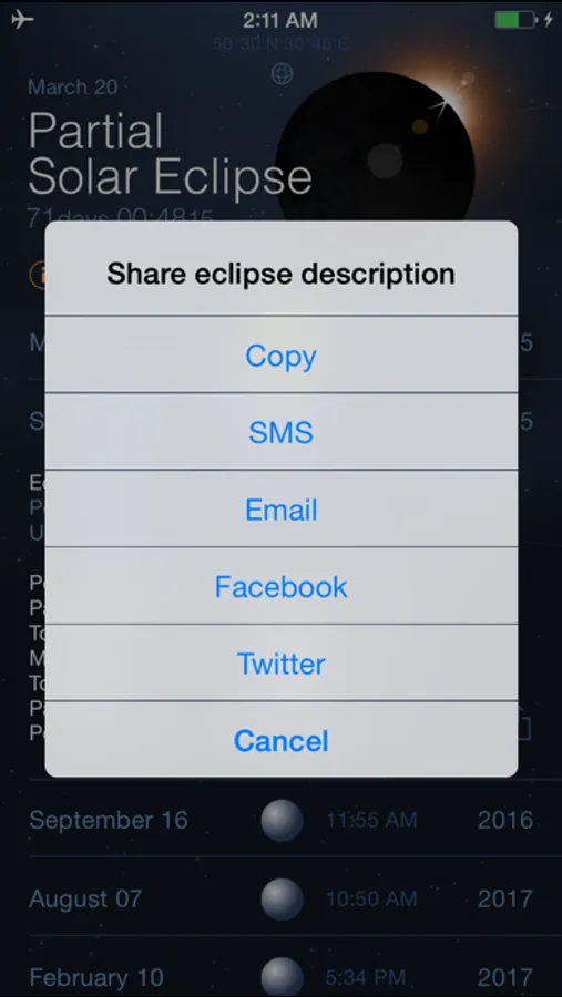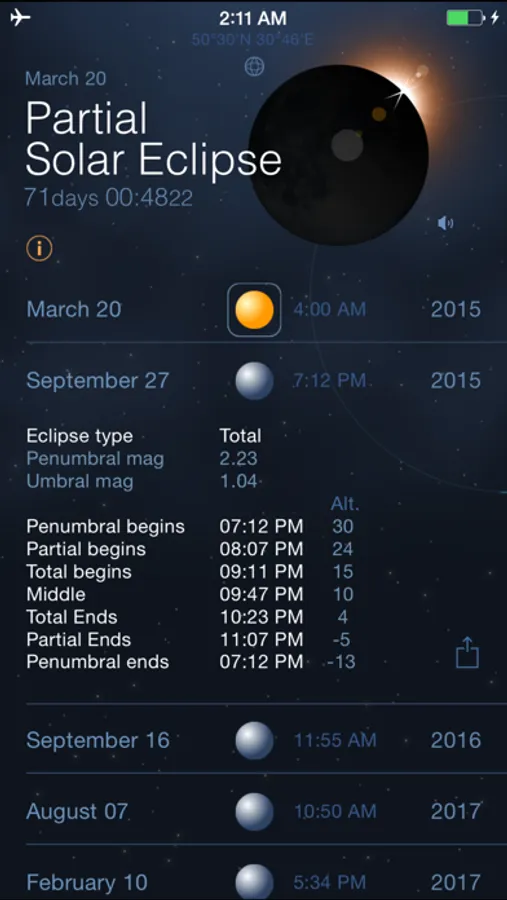 With this app you can learn when partial or full eclipse happens at any location in the world.