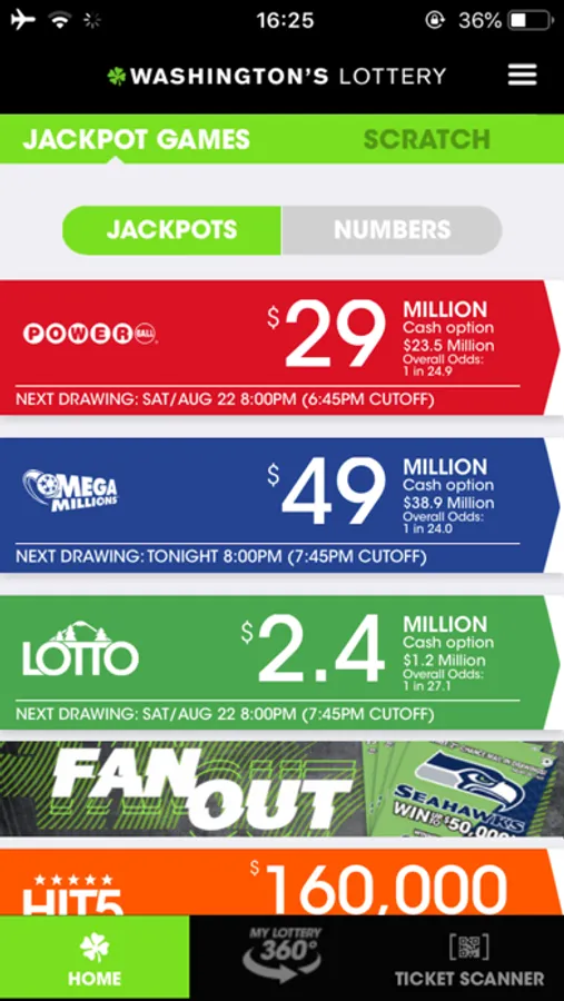 Imagine even bigger with Washington’s Lottery official mobile app. A built-in ticket scanner lets you scan both Scratch and Draw tickets to see if you’ve won. And, with the new MyLottery 360° program, you’ll earn points for prizes from every eligible non-winning ticket that you scan.