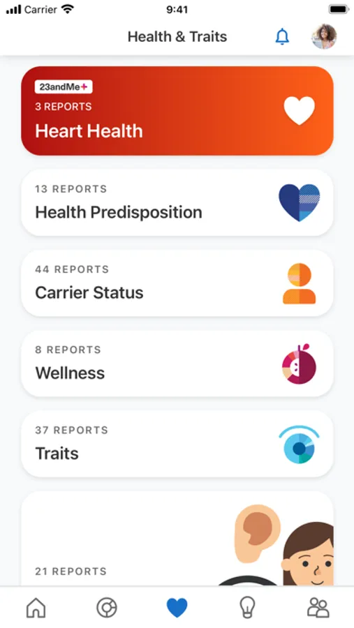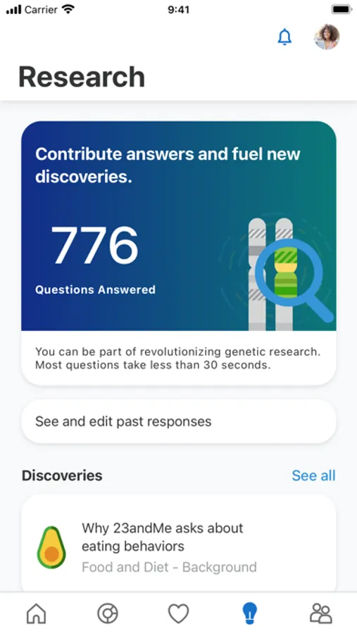 In the app, you can also choose to answer survey questions and participate in 23andMe research. Link your account with Apple HealthKit™ and participate in activity tracking enhanced research initiatives.