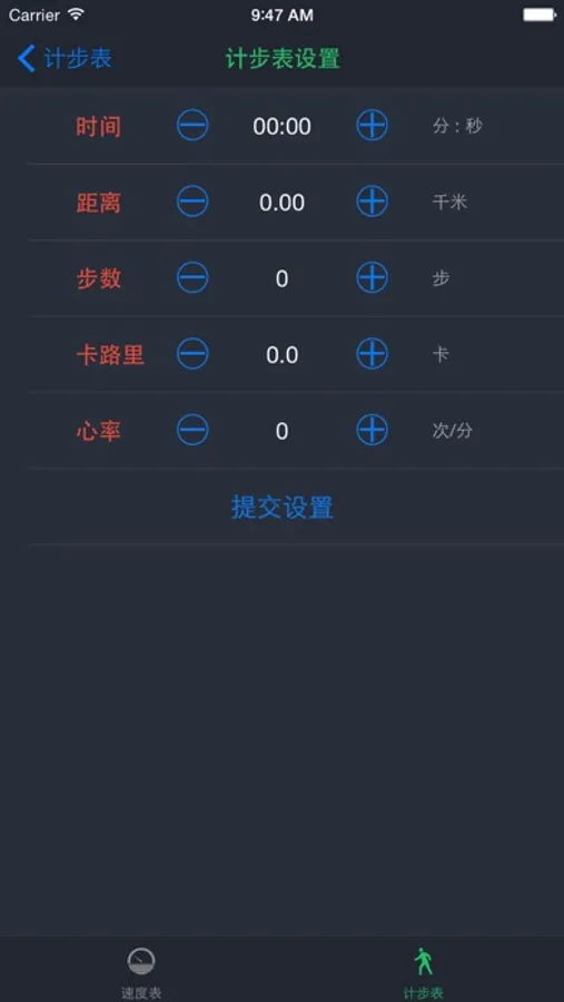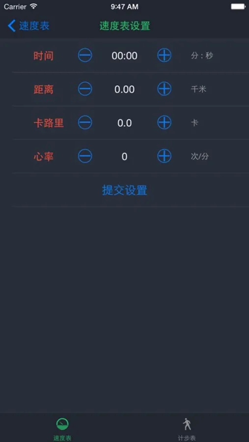 2. 在速度表与计步表左上角的设置功能中, 设置的数值为均为倒计模式的开始值, 当提交设置成功后, 设备将以倒计的模式运行, 即在运动时, 将以递减的方式显示;