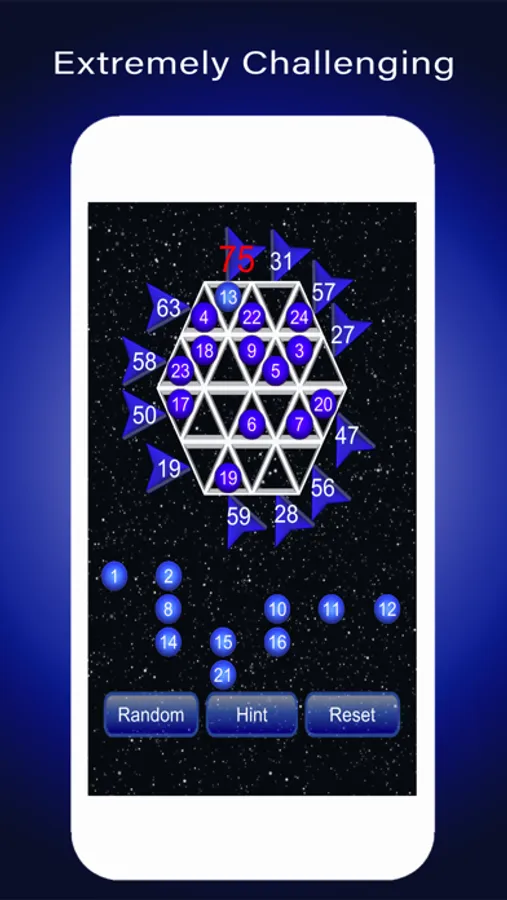 This hexagon game app is a mensa level number puzzle based on magic squares and magic hexagons. Specifically there are 4 levels from fairly simple to almost impossible! Extremely challenging. Intriguingly on the hardest level there are over 50 million solutions but finding just one can be difficult. There are 59456127 ways of placing the numbers 1 – 24 in the correct order so that all the horizontal and diagonal lines add up to 75.