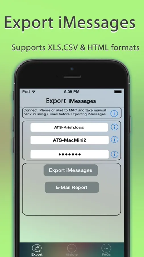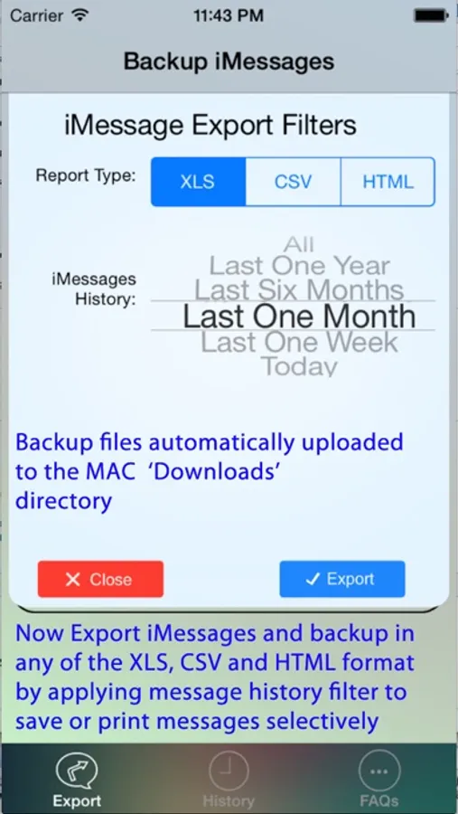 Please refer FAQ tab with in the App for instructions on how to Export Messages using the App.