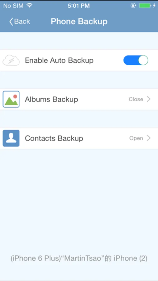6. Auto backup: Supports automatically backup your albums and contacts to the device (this functionality is not activated by default).