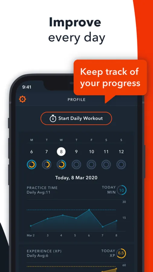 • Track your daily practice time and achieved experience points