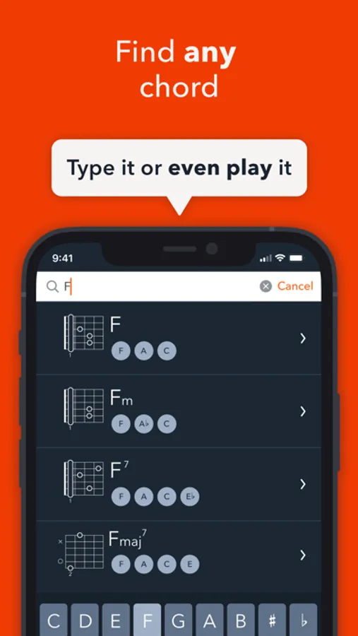 • Chord Dictation: Record chords by playing them on your guitar one at a time