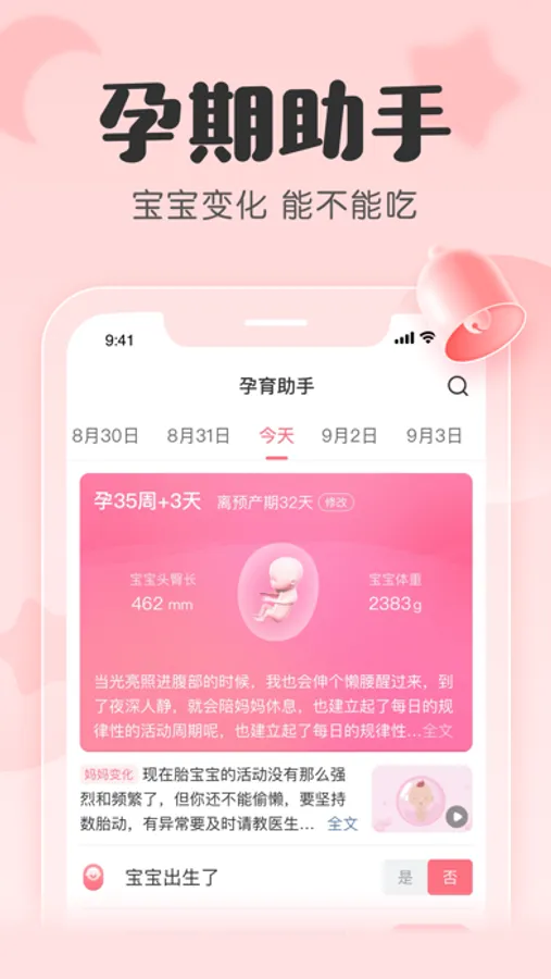 模拟B超图像,清晰捕捉宝宝的每日变化;能不能做、能不能吃一查便知,提供孕期不同阶段的营养食谱;每一次产检提醒和数据解释,轻松看懂产检单;在线了解孕期症状,告别孕慌慌,让妈妈孕期无忧。