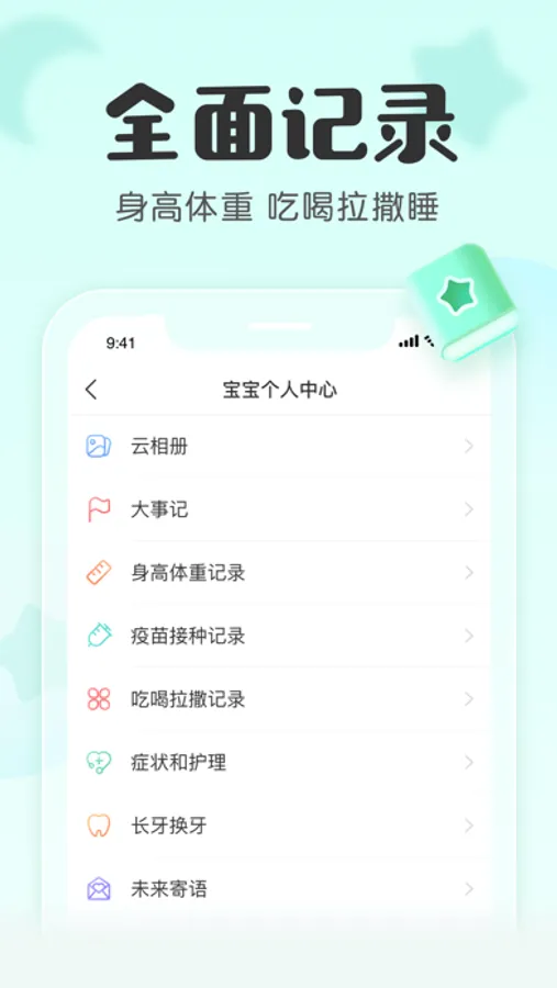 分类记录宝宝的身高体重、疫苗接种、吃喝拉撒睡、长牙换牙、宝宝档案;支持邀请亲友共同记录、仅自己可见、亲友点赞评论、记录多个宝宝、原图保存等。