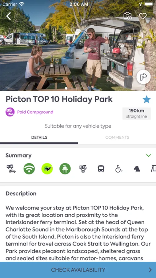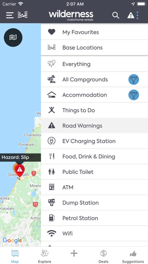 The Wildernes NZ app displays your current GPS location then shows the nearest campsite and holiday parks, (free, low cost and fully serviced), petrol station, free wifi, real-time road alerts, supermarkets, dump stations, public toilets, LPG filling stations, laundromats and everything you need when you’re on the road.